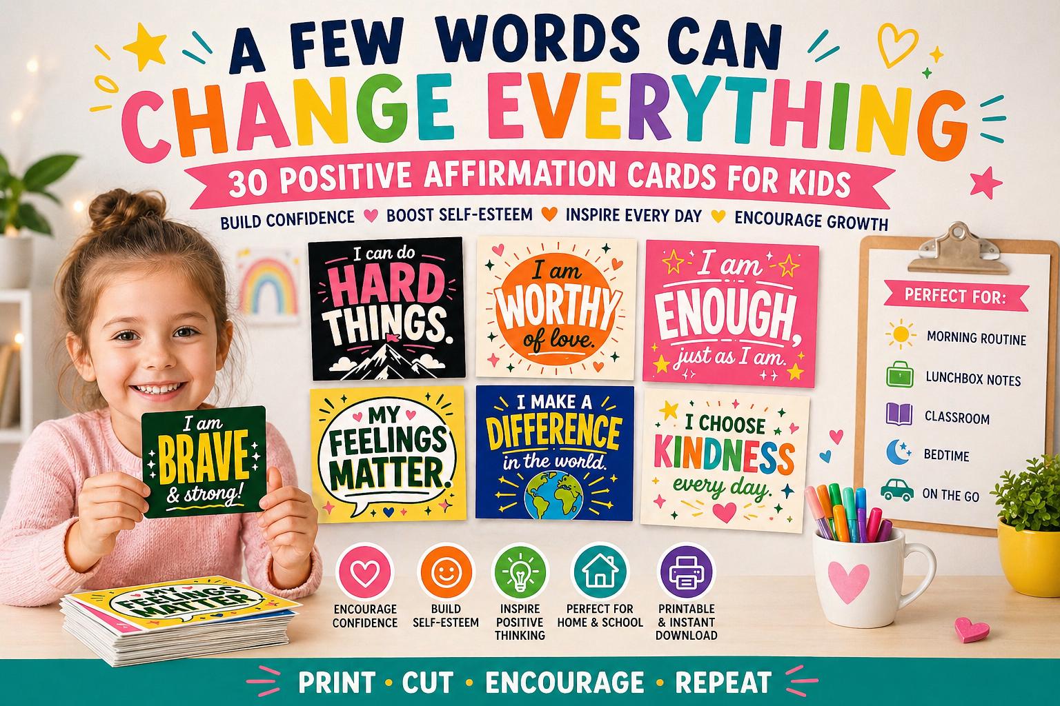 Building a confident, positive inner voice in the kids you love doesn't require a lot of time or money. It just requires consistency and the right tools. Our 30 Kids Affirmation Cards are an instant digital download — print them today and start tomorrow morning. They're designed for ages 6–13, work beautifully at home or in the classroom, and come ready to print, cut, and use.